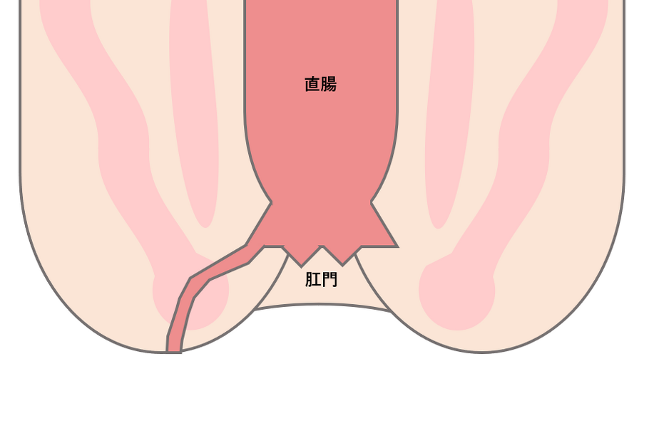 直腸と肛門の境目にあたる歯状線に傷がつき、便に混じっている細菌などが原因で炎症を起こし化膿してしまうことがあります(肛門周囲膿瘍)。肛門周囲膿瘍が慢性化すると、直腸~肛門と肛門周囲の皮膚の間に膿(うみ)がたまり、瘻管(トンネル状の穴)が形成されます。この状態をあな痔(痔瘻)と言います。