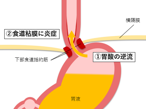 食道粘膜は胃粘膜と違って、胃酸(強塩酸)の刺激から保護する仕組み(胃には保護するための粘液がある)がないので、胃酸に触れると炎症を起こしてしまいます。食道の粘膜が胃酸に触れてしまう原因として、食道と胃の境目である噴門部の筋肉(下部食道括約筋)の筋力低下による逆流、食道裂孔ヘルニア、腹圧の上昇などが挙げられます。