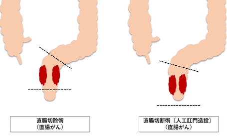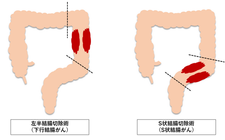 病変がある部位によって切除する腸管の範囲が決まります。術式には回盲部切除術、結腸右半切除術、結腸部分切除術、結腸左半切除術、S状結腸切除術、前方切除術、直腸切断術などの方法があります。 また、浸潤などで病変を切除できない場合には、便が流れるように迂回路を作るバイパス手術や人工肛門を作る手術を行うことがあります。