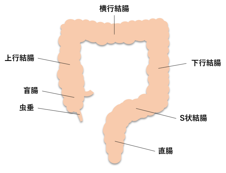 大腸は結腸(盲腸、上行結腸、横行結腸、下行結腸、S状結腸)と直腸からなります。大腸の主な役割は、水分を吸収することです。小腸で消化吸収された食物の残りは大腸で水分を吸い取られ、だんだんと固形の便になっていきます。