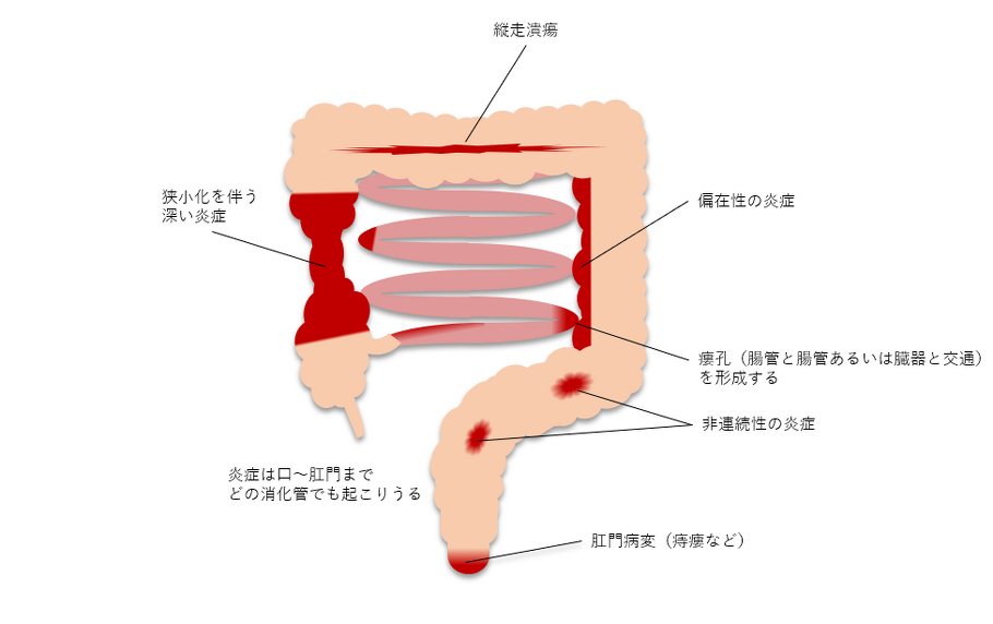 また、難治性の痔瘻などの肛門病変を併発することが多く、肛門病変を契機にクローン病と診断されることも少なくありません。