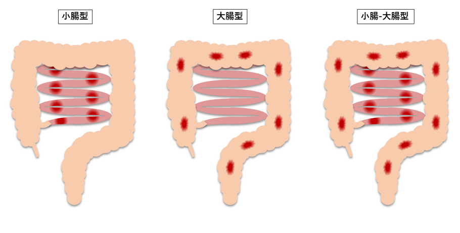 クローン病の病変は消化管の中でも特に小腸と大腸に多くみられ、病変が存在する臓器別に小腸型、大腸型、小腸大腸型の3タイプに分類されます。