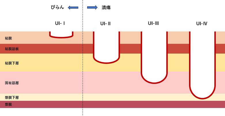 | Ul-Ⅱ | 組織欠損が粘膜下層に及ぶ潰瘍 |