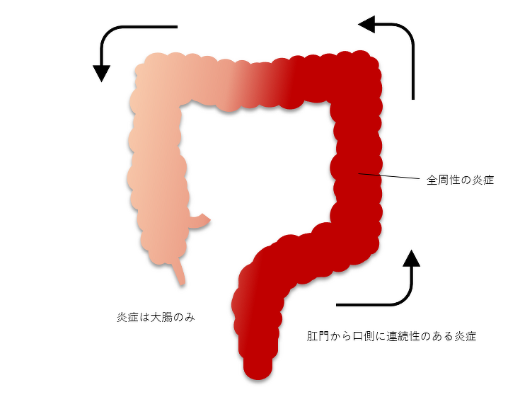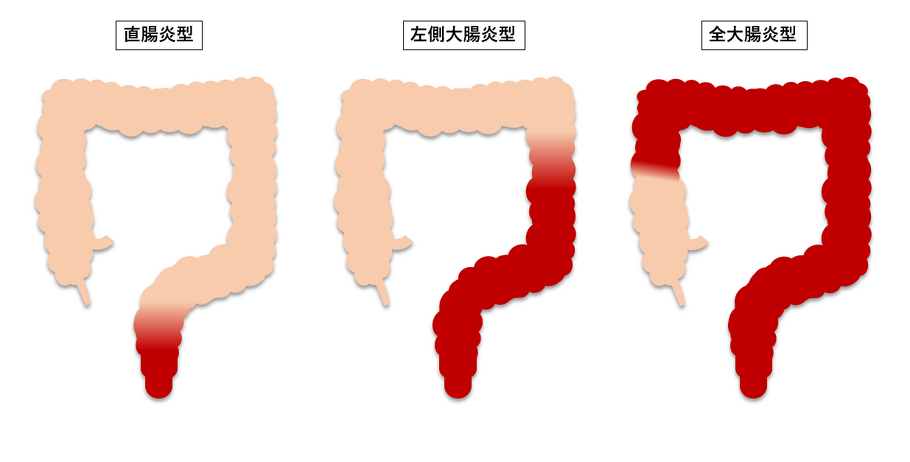 大腸だけに炎症が生じ、肛門から口側方向に向かって逆行性・連続性に広がります。病変の範囲は直腸に限局する直腸炎型、大腸の脾彎曲部までに留まる左側大腸炎型、脾彎曲部を越えて深部へ広がる全大腸炎型に分類され、個々の患者さんにより病型が異なります。