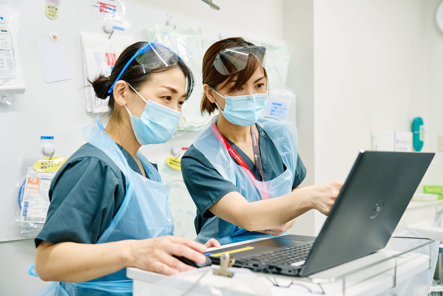 内視鏡センターでは、医師、臨床工学技士、診療放射線技師、臨床検査技師、医師事務作業補助者など多職種と連携を図りながら、スムーズな検査を行うための準備や介助に努めています。安心して検査・治療を受けていただくために、丁寧な観察やバイタルチェックを行い、患者さんの不安な思いに寄り添った看護を提供してまいります。