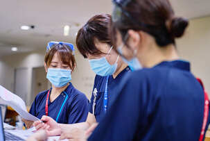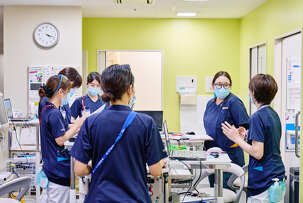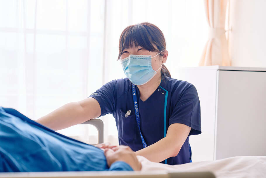 病棟には、胃・大腸の手術・内視鏡的治療・抗がん剤治療・がん性疼痛の緩和、炎症性腸疾患の治療などを必要としている患者さんが多く入院しています。様々な患者さんがいるため、日々多くの気づき、学びがあります。予定手術から緊急手術、昼夜問わずの緊急入院を受け入れ、入退院がとても多いですが、スタッフ同士声をかけあい協力して看護にあたっています。医師・多職種と連携し、患者・家族の思いに寄り添いながら、身体的・精神的ケア、最善の医療・看護が提供できるように取り組んでいます。