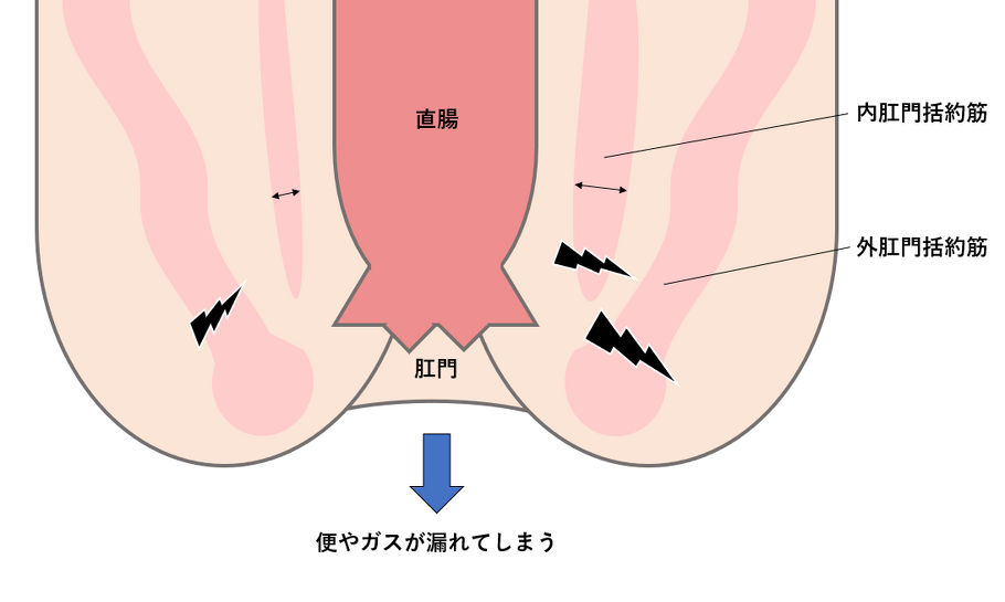 肛門には内肛門括約筋と外肛門括約筋があり、これらの括約筋が切れたり、薄くなったりすることで、便を保持するための機能が低下することを指します。