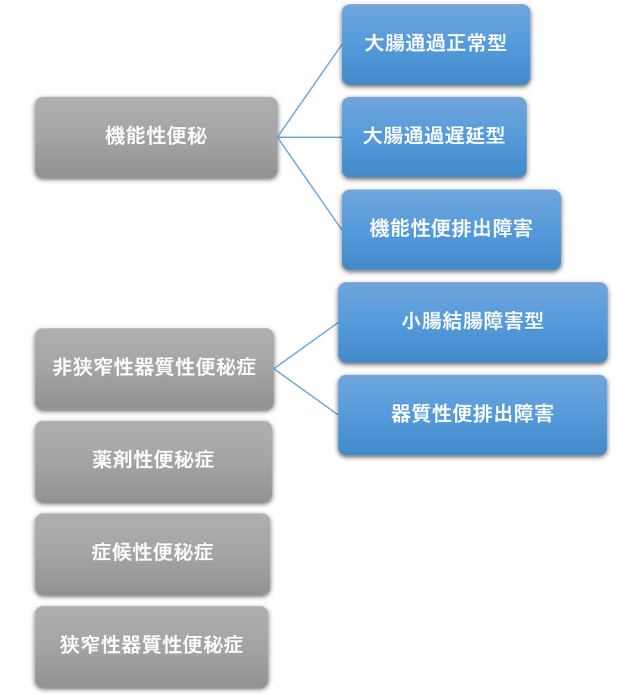 - 機能性便秘:大腸通過正常型、大腸通過遅延型、機能性便排出障害