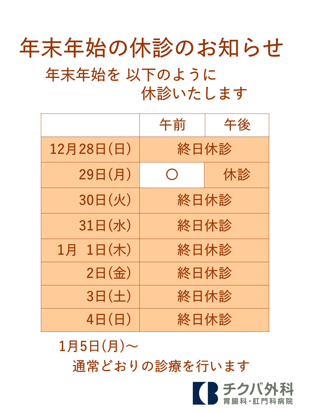 年末・年始の休診は、以下の通りとなっております。ご了承ください。