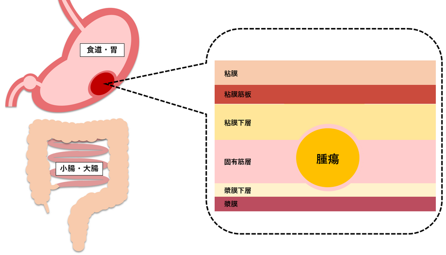 粘膜下腫瘍とは粘膜の下(粘膜下層~固有筋層)に発生する腫瘍のことを指します。食道~大腸までどの部位でも発生します。